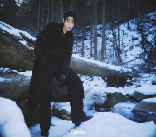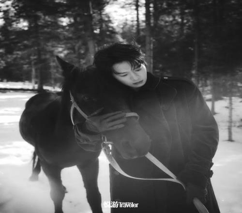 车辆在一处门形的山脚停下。往下是陡坡,遍布大小碎石,上方覆着不知深浅的雪。魏大勋一身黑衣黑裤,一脚踏进坡下的林间雪原里。白桦、雪松,旷野里格外清冽的空气,冰层下的汩汩溪流,眼前一切都让身为东北人的他熟悉而亲近。镜头对准了横亘在溪流上的一截枯木,他轻快地走过去,斜斜地倚着,目光在枯叶、松针、树影光斑间逡巡,最后定格在一匹悄然现身的黑色骏马上。