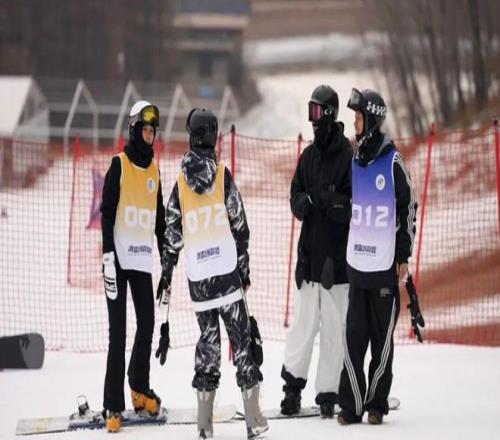 SRA滑雪场联盟2025—2026“冰雪丝路杯”粉雪联赛,精英赛——庙香山温泉滑雪度假区比赛现场,参赛选手交流比赛技巧(摄影 杨浩)