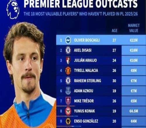 德转本赛季英超0出场球员身价:迪萨西、马拉西亚、斯特林在列