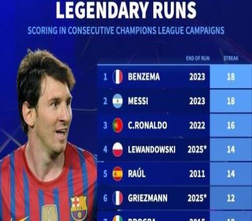 欧冠连续赛季进球纪录:本泽马、梅西连续18赛季进球第1