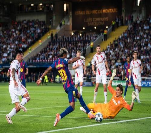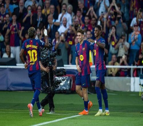 10月21日,巴塞罗那队球员在得分后庆祝。新华社发(胡安·戈萨摄)