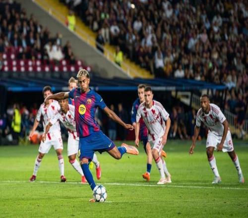 10月21日,巴塞罗那队球员亚马尔(前)在比赛中点球破门。新华社发(胡安·戈萨摄)